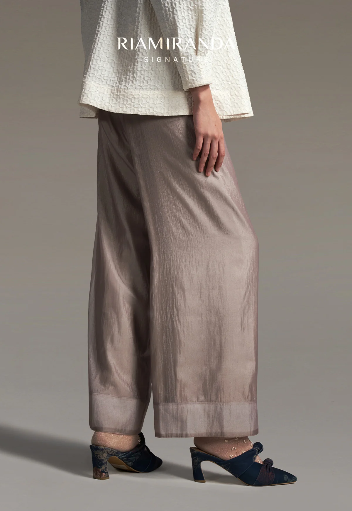 Wide-leg pants with a clean, structured cut that exude elegance and ease. Designed as a versatile piece, it complements any occasion with timeless sophistication and understated charm.